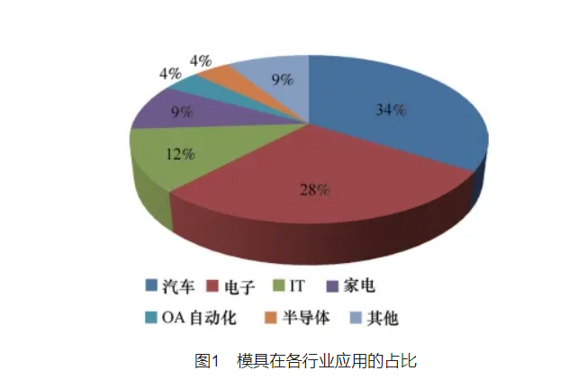 据星空c5彩票最新版工业协会统计数据显示,目前,我国模具产品的主要应用领域集中于汽车、电子、IT及家电等行业。这些行业往往需要精密的工具或零部件,而模具正是为这些行业提供了一种高效、经济的生产方式。在模具应用行业,汽车行业的占比最大,约为34%,电子行业约占28%,IT行业约占12%,家电行业占比9%,OA自动化及半导体分别占比4%,如图1所示。