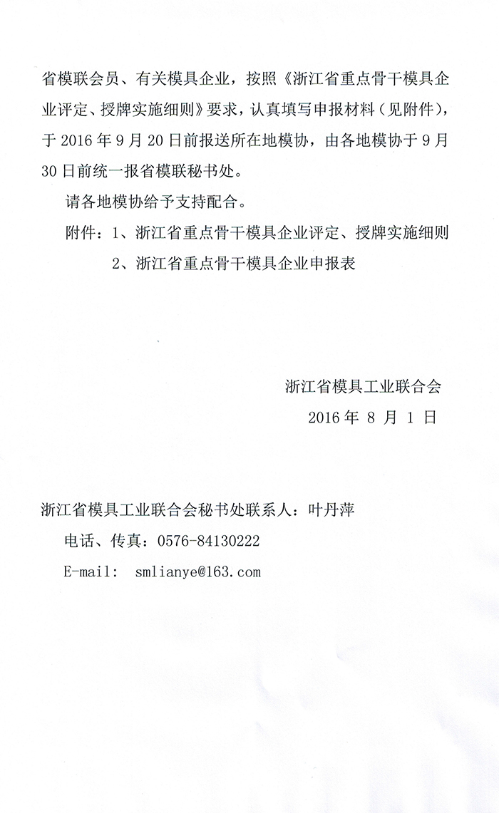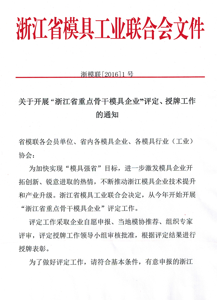 关于开展“浙江省重点骨干模具企业”评定、授牌工作的通知